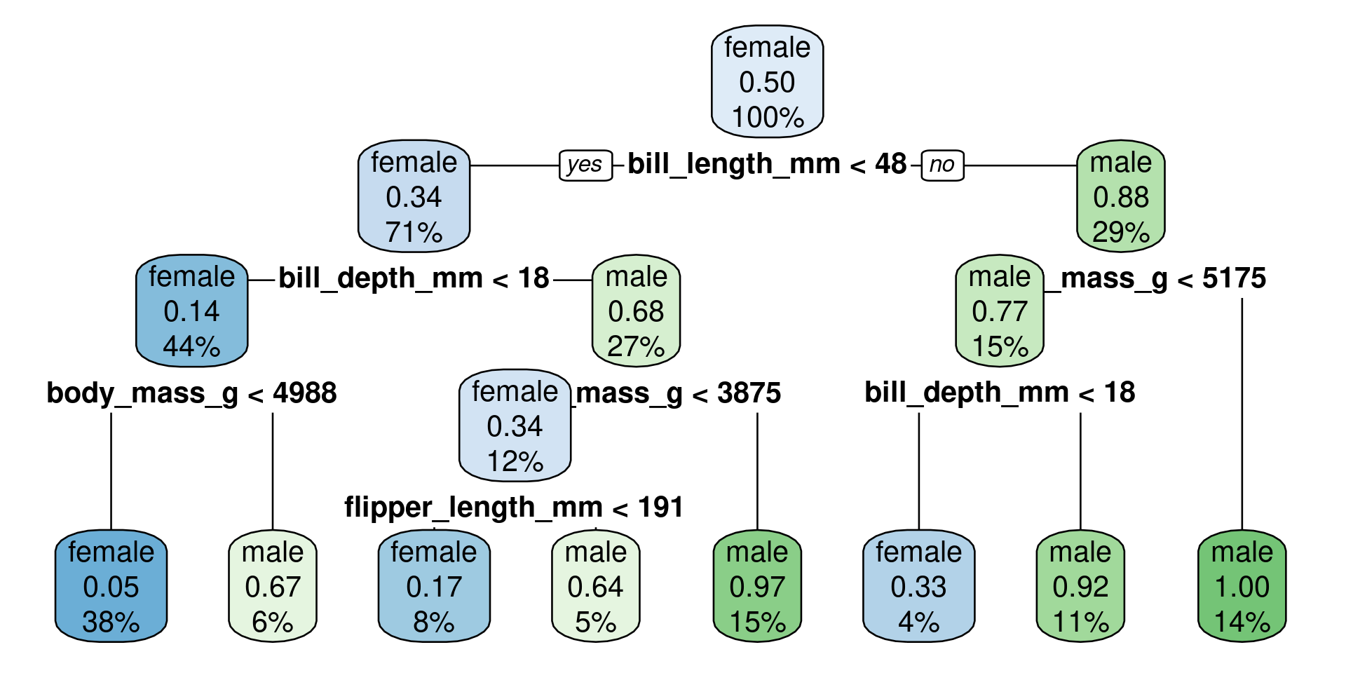 For each terminal node a certain value is predicted (the mean of the remaining penguins)