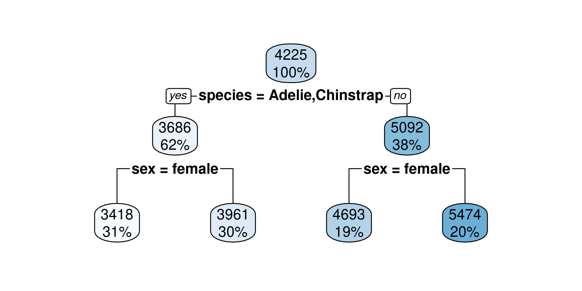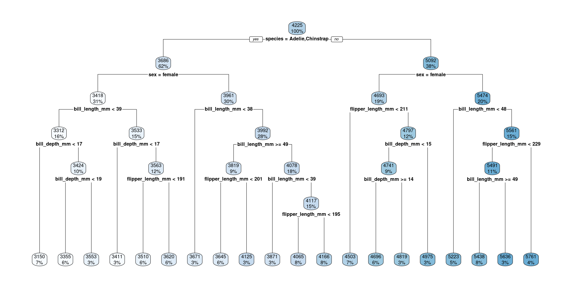 peng_regtree_pred <-predict(peng_regtree_fit, peng_test) |>bind_cols(peng_test)peng_regtree_pred |>select(.pred, body_mass_g, species, sex) |>slice(10*(1:10)) # show same selected rows