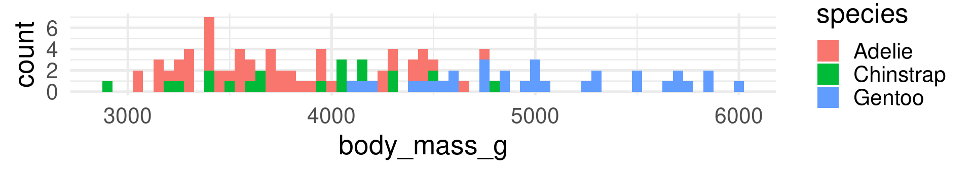 peng_test |>ggplot(aes(x=body_mass_g, fill = species)) +geom_histogram(binwidth =50) +theme_minimal(base_size =20)