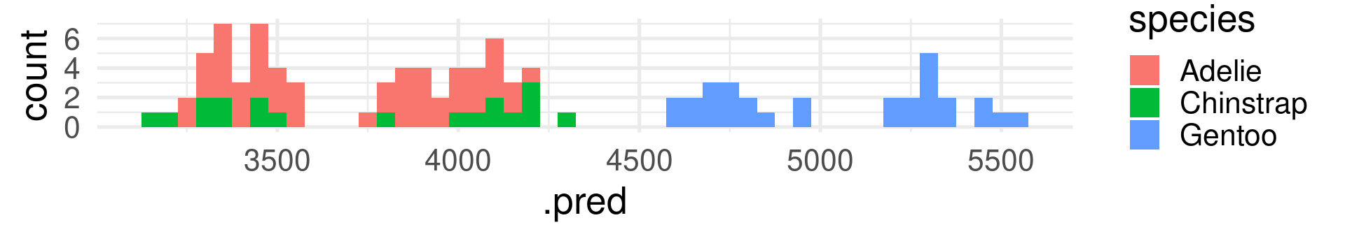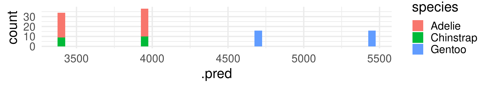 peng_regtree_pred |>ggplot(aes(x=.pred, fill = species)) +geom_histogram(binwidth =50) +theme_minimal(base_size =20)