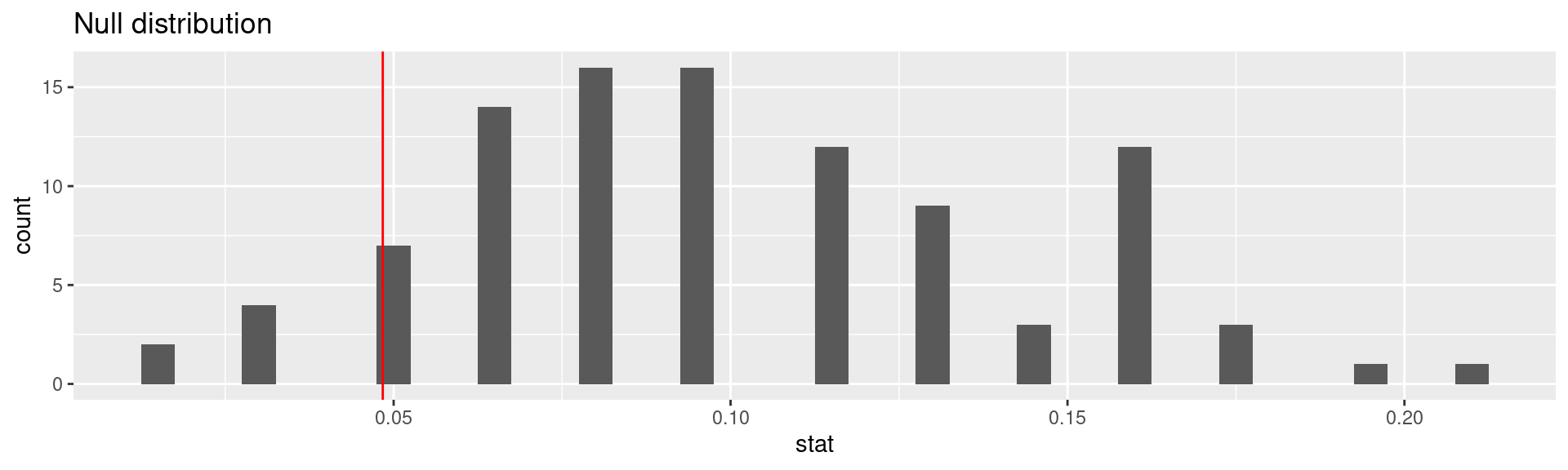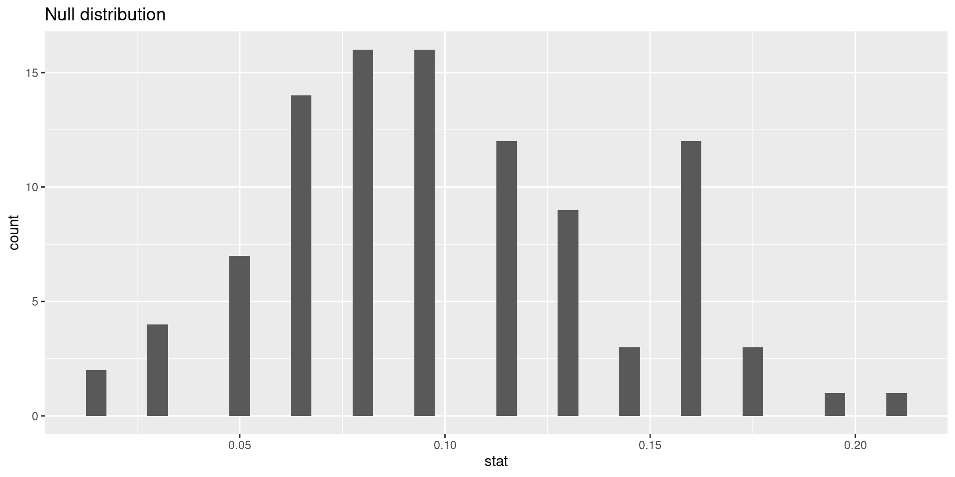 library(tidymodels)set.seed(10)null_dist <- organ_donor |>specify(response = outcome, success ="complication") |>hypothesize(null ="point", p =c("complication"=0.10, "no complication"=0.90)) |>generate(reps =100, type ="draw") |>calculate(stat ="prop")null_dist