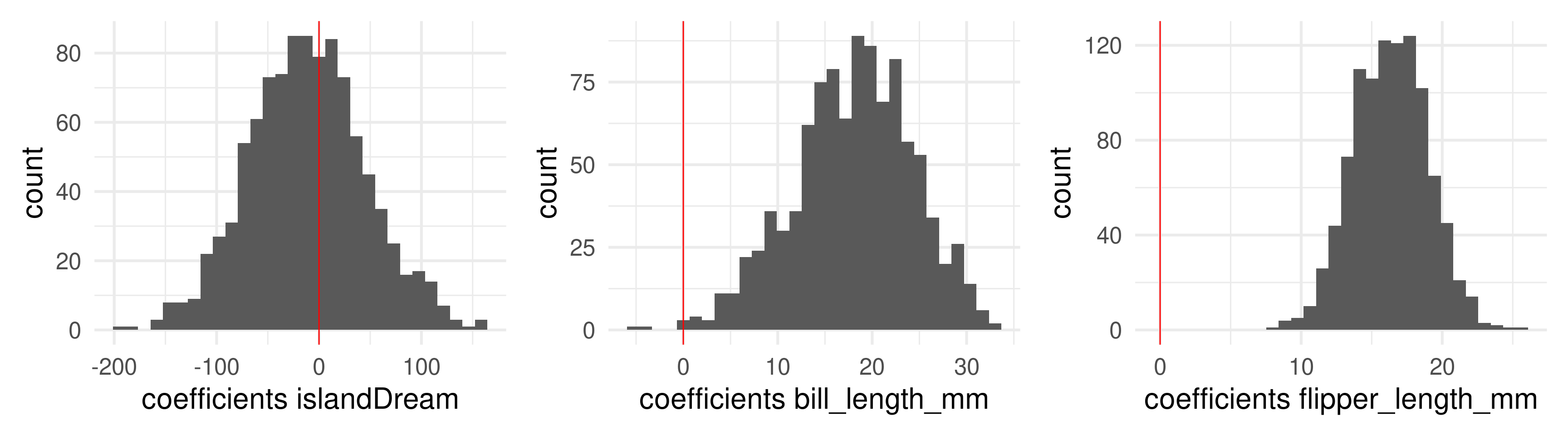 A linear model for body mass of penguins: \(y_i = \beta_0 + \beta_1 x_i + \dots + \beta_m x_m + \varepsilon_i\).